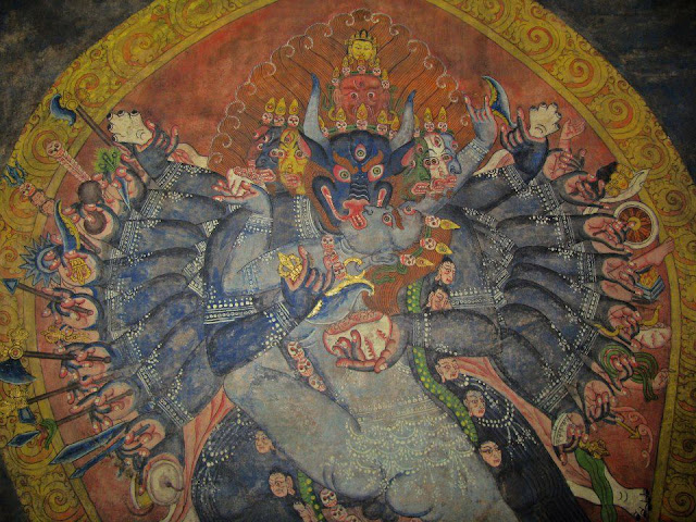 The Buddhist Mahākāla used to fly, it is said, between Kāśī and Lhasa, but was immobilized in mid-air by a powerful Tibetan Lama and forced to settle down at the edge of the Tundikhel royal parade ground. "In his role as defender and guardian, Mahākāla is one of the chief protectors of all the other Valley gods, a task he shares with Śañkata Bhairava of Tebahal, Kathmandu. In the Kathmandu Valley, representations of Mahākāla rarely conform to his textual description, and often incorporate aspects that are rightly those of other divinities: Samvara, Hevajra, and Heruka, emanations of Aksobhya. Conceptually related to Bhairava, from whom he probably derives, the Buddhist deity is teamed with Bhairava in practice, shares some aspects of his iconography, and the name Mahākāla, one of Bhairava's epithets. Like Bhairava, too, Nepalis conceive of Mahākāla as a pītha devatā, the temple of the Tundikhel Mahākāla, Kathmandu, for example, representing his pītha, which is paired with a companion deochem inside the town. Thus it is often difficult, if not impossible, to distinguish the two deities. Iconographically, even the famous Kāla Bhairava of the Kathmandu Darbar Square conforms as much to Samvara as to Bhairava." The spontaneity with which Tibetan pilgrims make it a point to venerate this Kāla Bhairab at Hanumān Dhoka is no doubt due to this identification. It is significant that the Newar Vajrācāryas, for whom Bhairava is to all appearance not the kuladevatā, are nevertheless custodians of his secrets and sometimes even central officiants at his public cult for the Hindu community. Particularly venerated within the Gelugpa sect, the Vajra-Bhairava mentioned in an inscription of Śivadeva II is another name of the fierce Yamāntaka, and the history of his lineage worship is found in the Tibetan text entitled "Jam-Doyangs Bzhao-Pai Rdorje," where the revelation is attributed to Mahāsiddha Lalitavajra of Uddyāna. The Kāśī-Lhasa axis so constant in the Newar ethnography of Bhairava is probably to be explained by Tibetan Buddhism having played, after his original adoption from Hindu India, a preponderant role in the spread of his cult in Nepal.